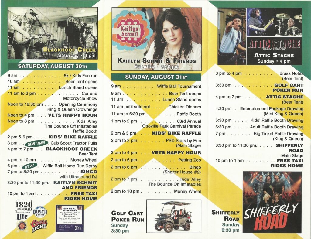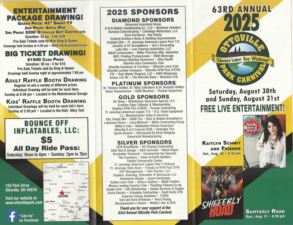 The 63rd Annual Park Carnival is right around the corner! If you haven’t signed up to volunteer yet, there is still time. Check out their Facebook page at Ottoville Park Carnival for signup opportunities, glance at some of the donors and full list of activities. You can also see the great line-up of entertainers and fun things to do at this years event below.
